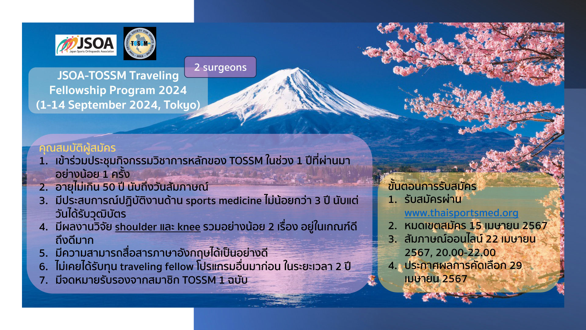 In 2024, we will be hosting the “TOSSM-JSOA Combined Meeting 2024” in collaboration with the JSOA (Japan Sports Orthopaedic Association as our guest society ). We hope to see you all and wish to take this year’s event to the next level.