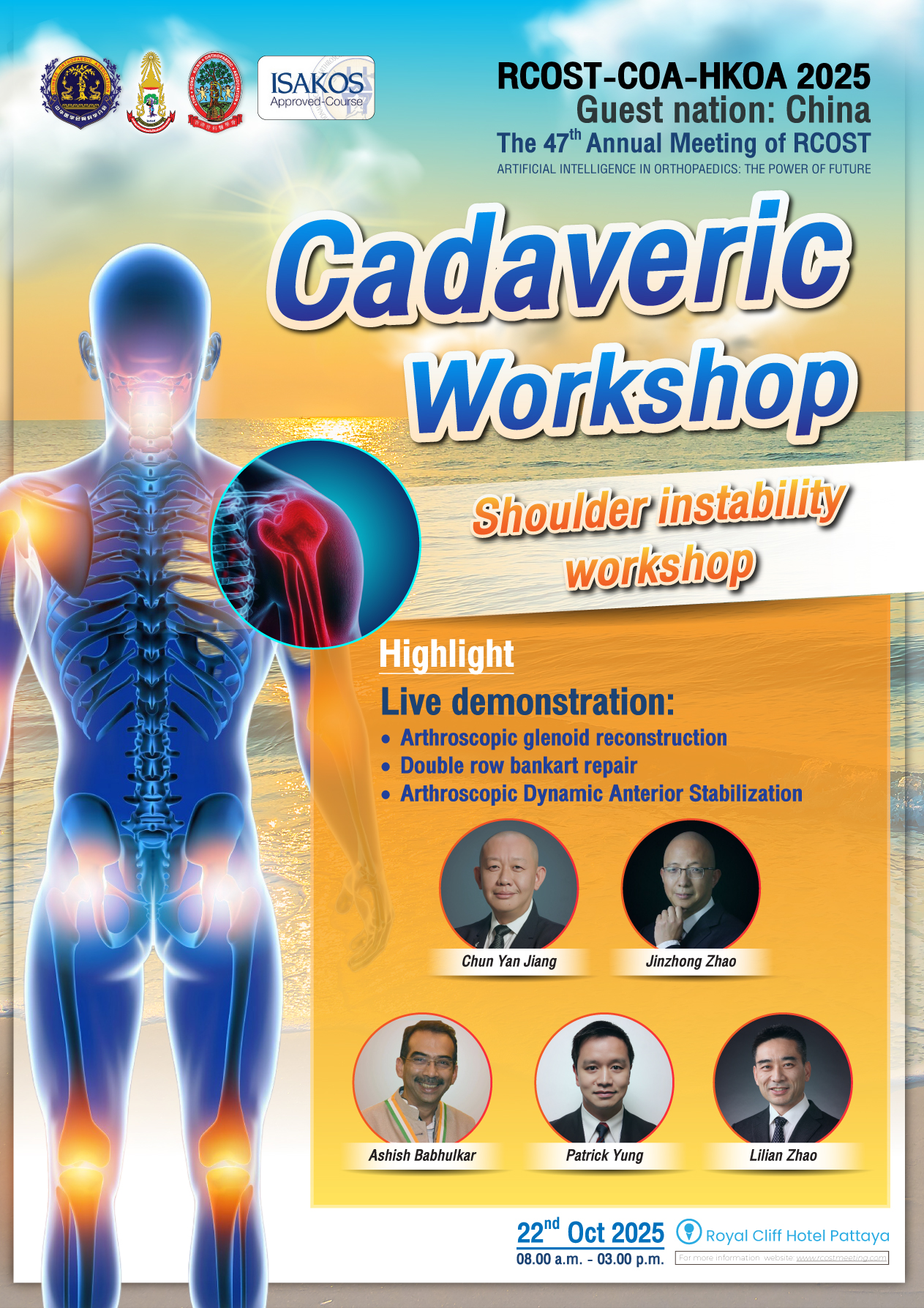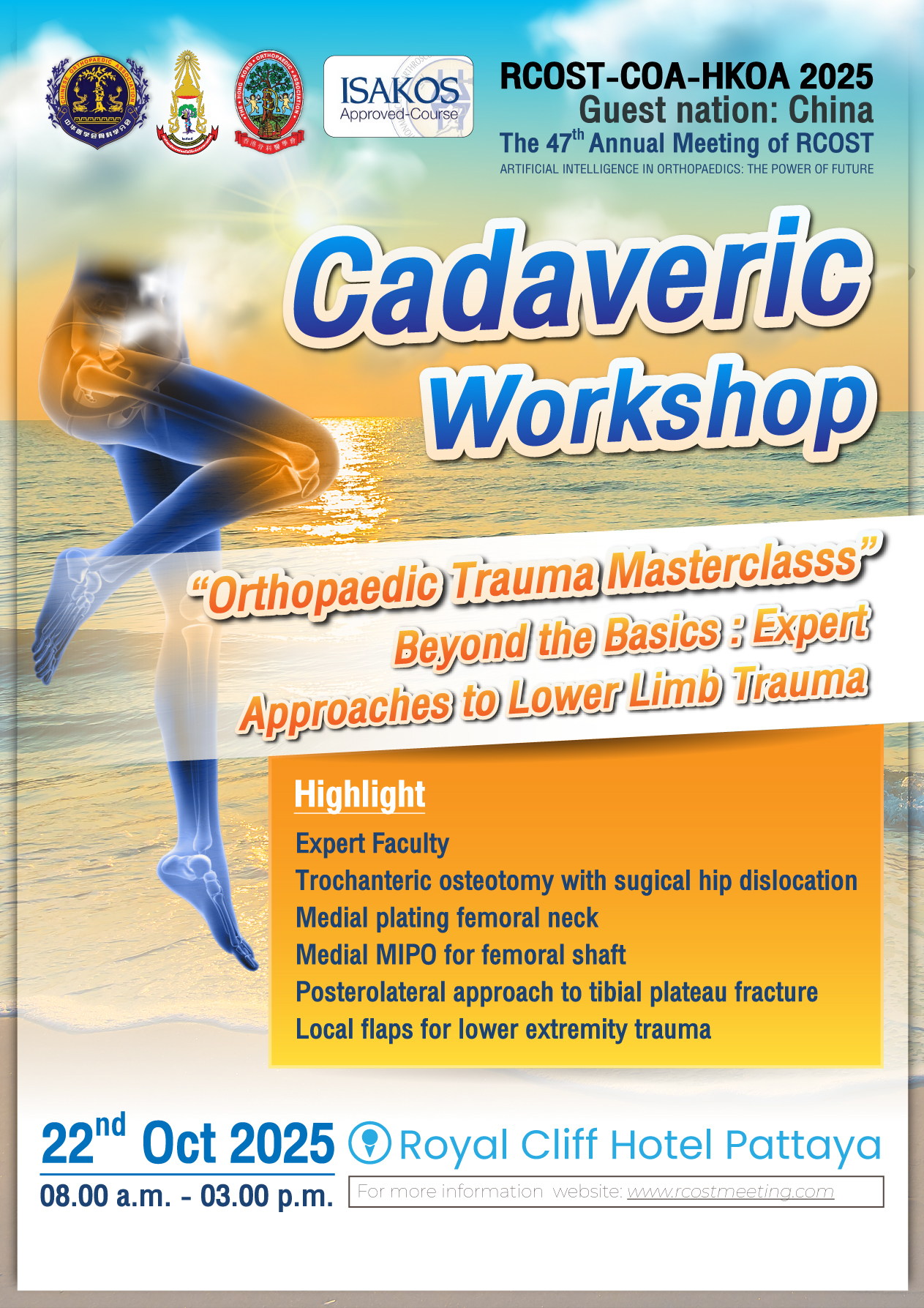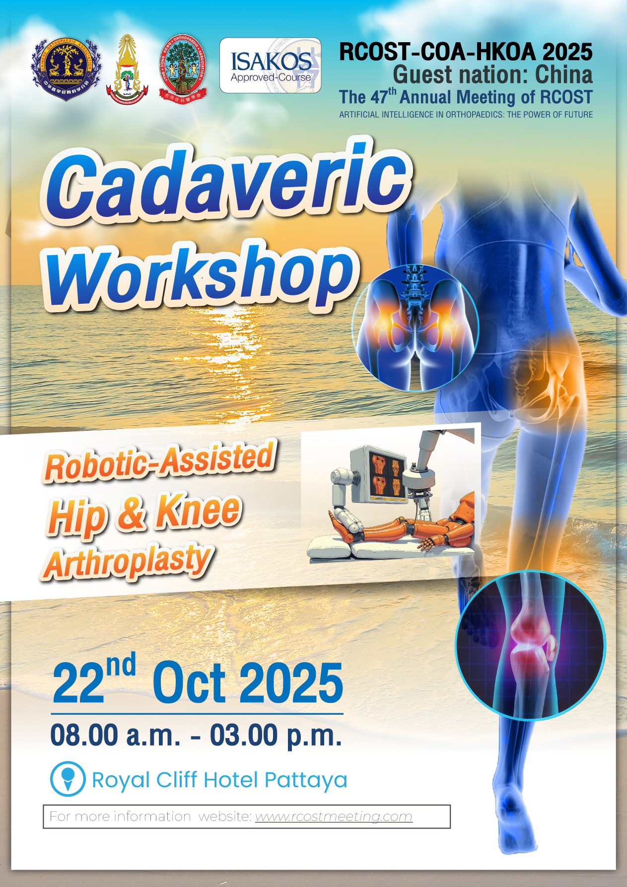It is with great pleasure that I invite you to join us at the 47th Annual Meeting of the Royal College of Orthopaedic Surgeons of Thailand (RCOST), to be held at PEACH, Royal Cliff Hotel, in the picturesque coastal city of Pattaya, from October 23rd to 25th, 2025.
